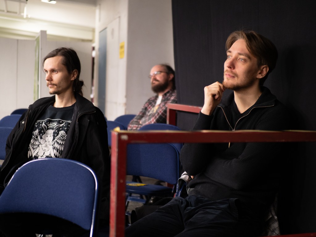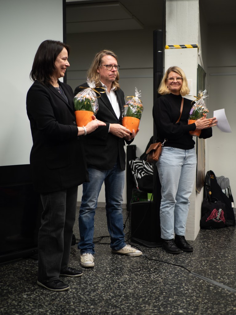 Artikkelikuvassa (yllä) vasemmalta Sisäinen ääni -elokuvan Otso Ahosola ja Lähetys-elokuvan Ari Tiihonen sekä Teemu Pelttari. Oikealla tuomaristoa. Kuva ©Laura Aro.