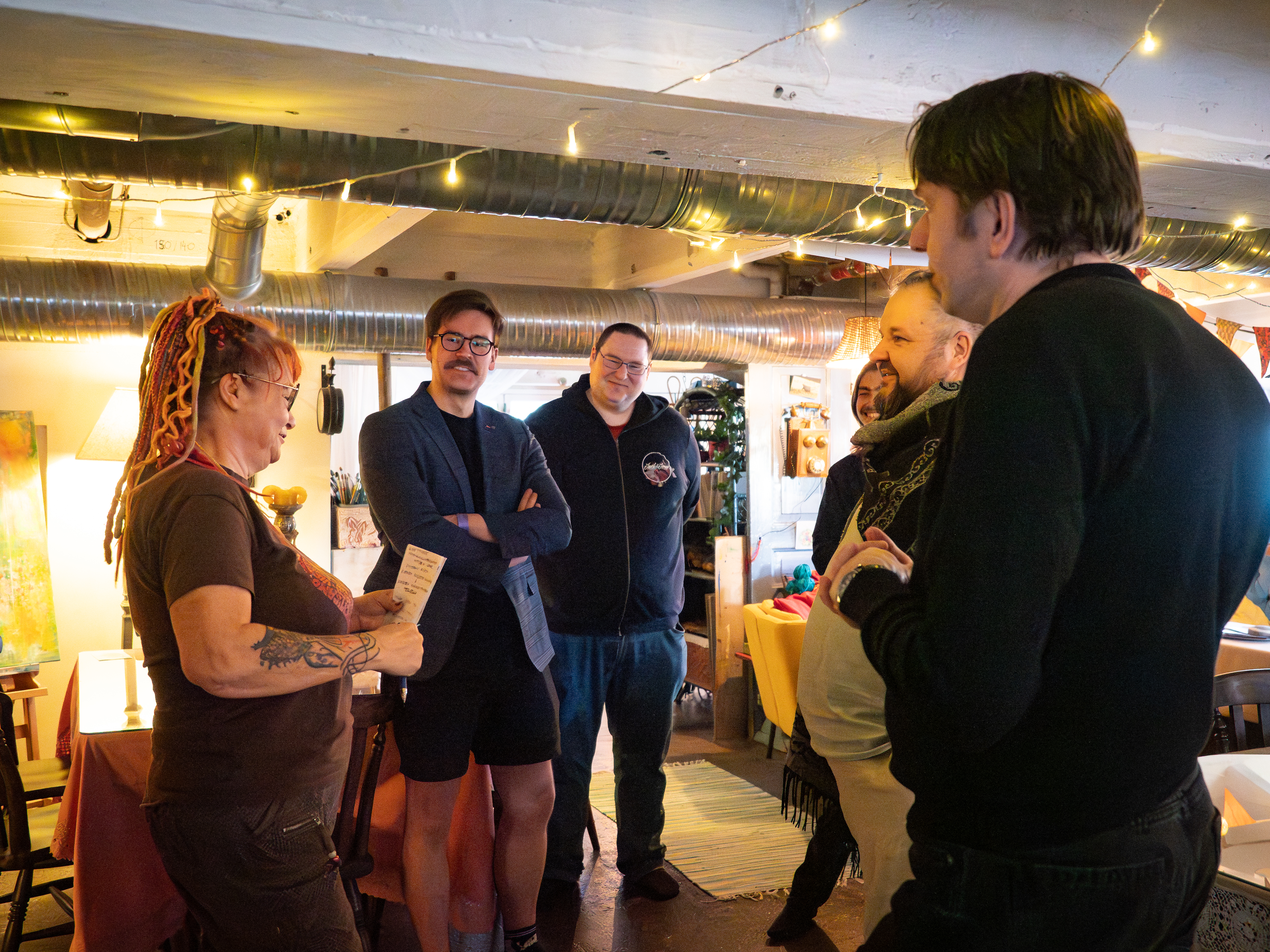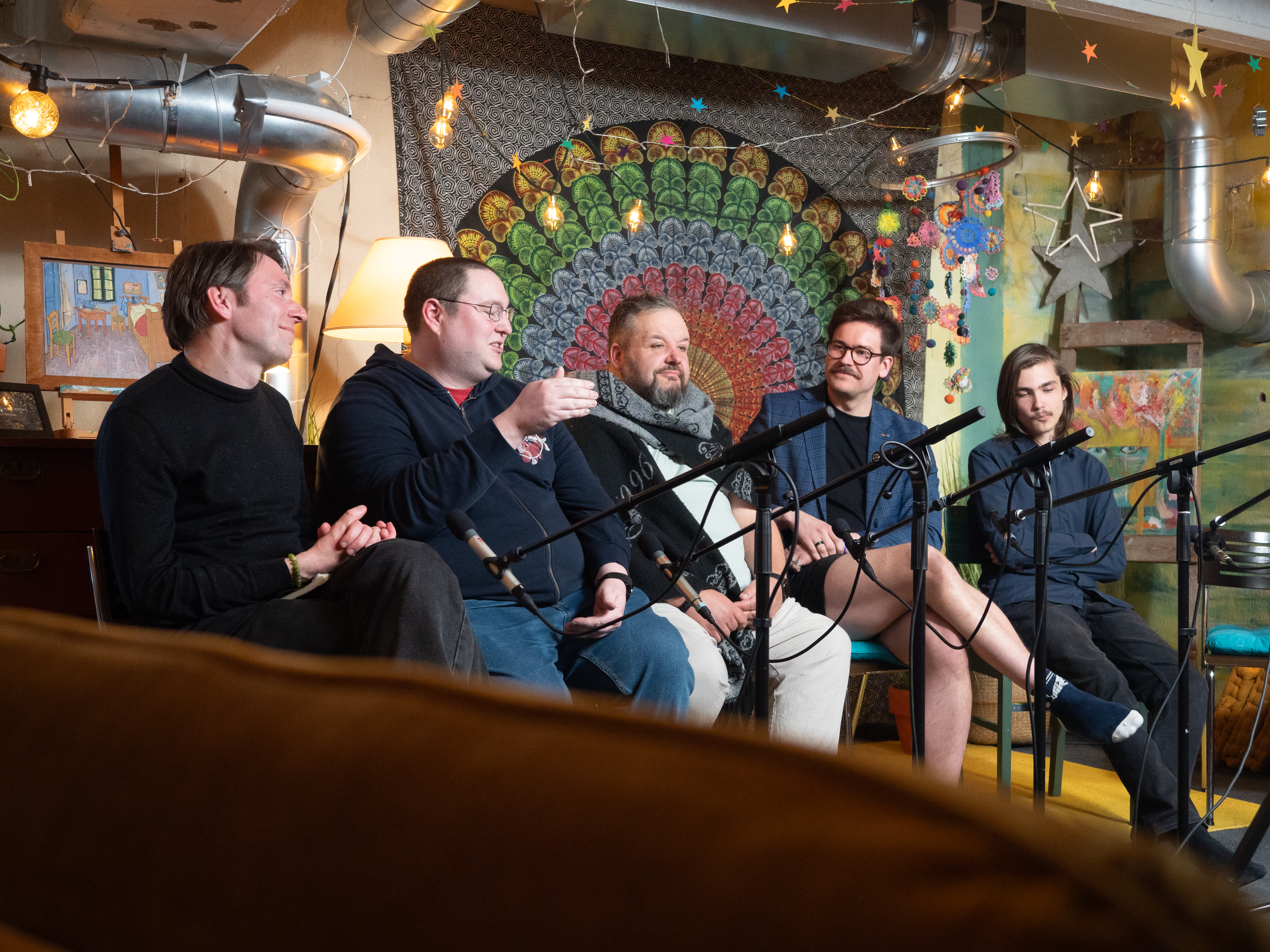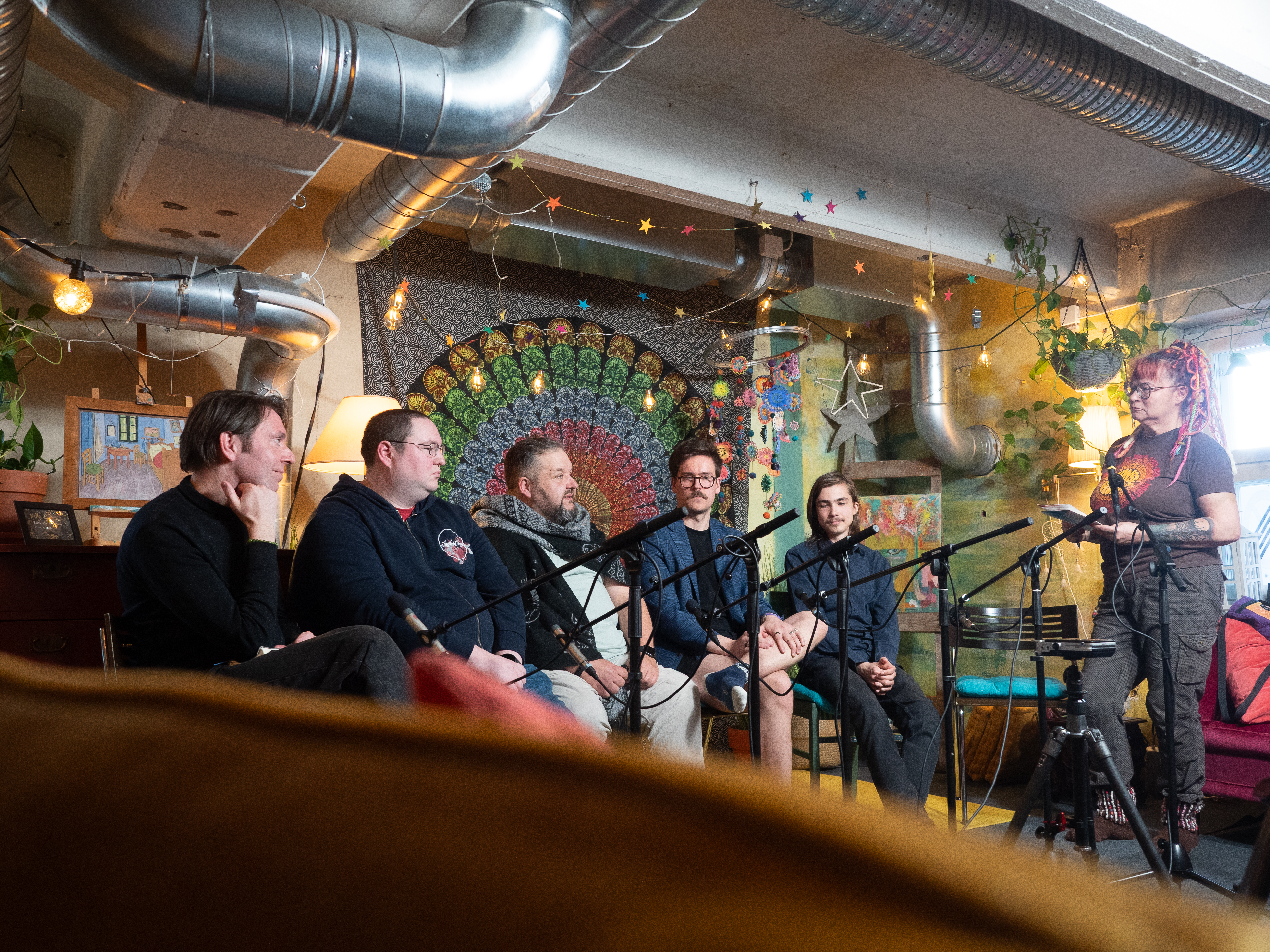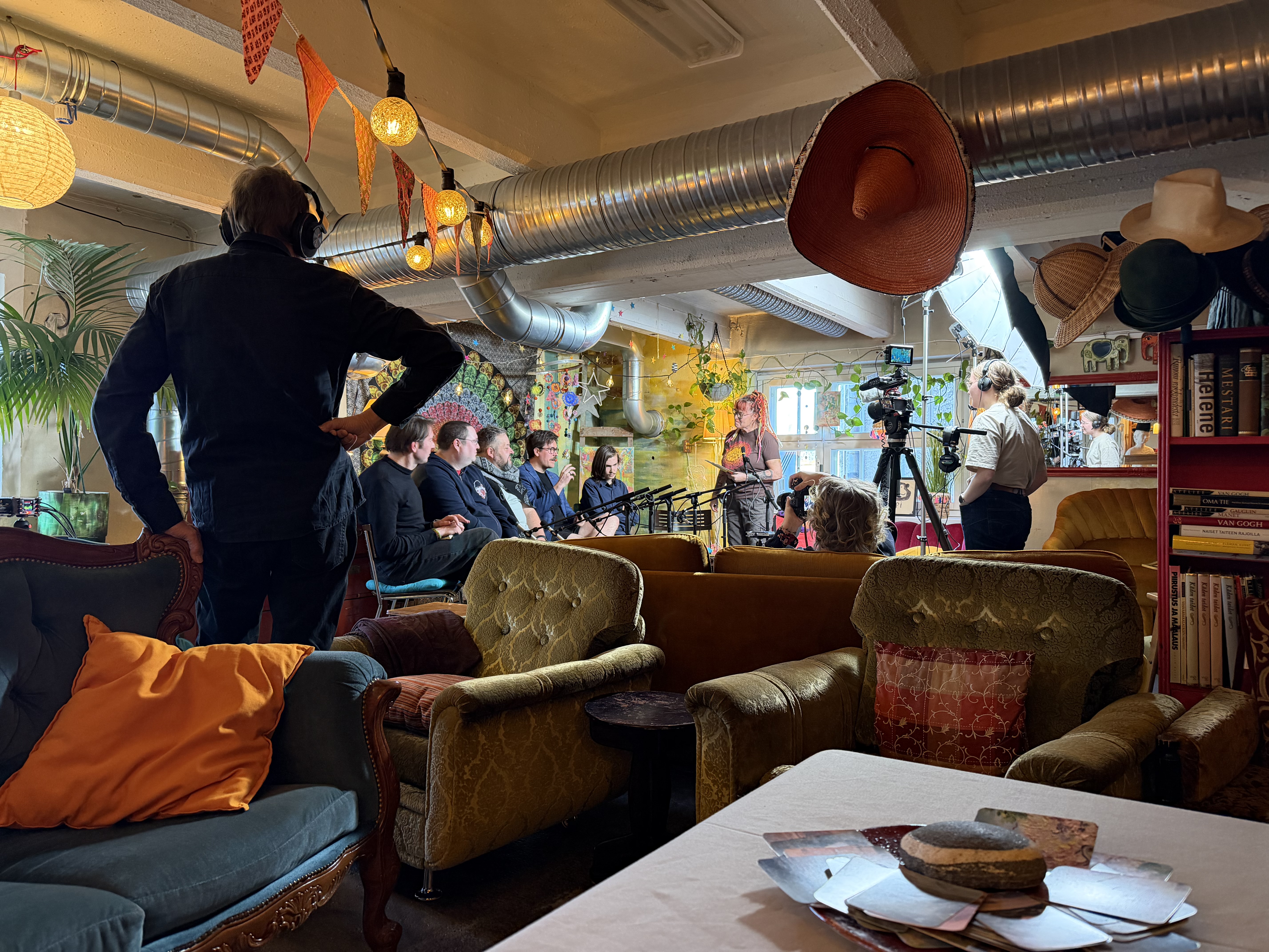 Hitusen hämyä indien paneelikeskustelu Pienen budjetin filosofiasta ja suurista unelmista järjestettiin 11.4. Hitusen hämyä indietapahtuman yhteydessä. Keskusteluun osallistuivat Aatos Äijö Espoosta, Miro Seppänen Tampereelta, Timo Puustinen Jyväskylästä, Jarno Harju Vantaalta ja Miikka J. Anttila Hämeenlinnasta. Keskustelu tallennettiin ja on tulossa loppuviikolla verkkoon. Tässä kuvasatoa keskusteluun valmistautumisesta ja tuokiokuvia keskustelusta. Kaikkien kuvien oikeudet Laura Arolla, kuvaajalla.