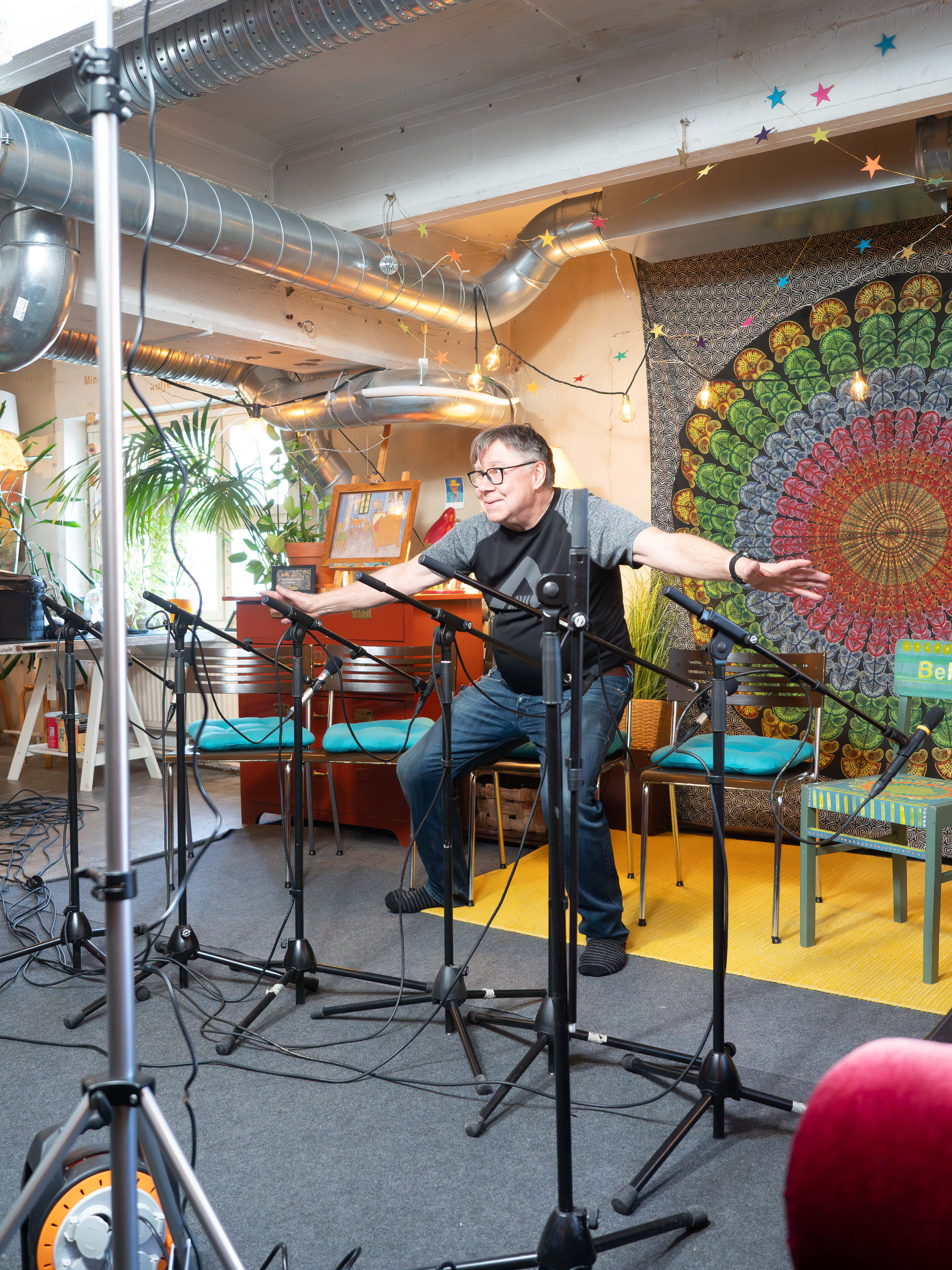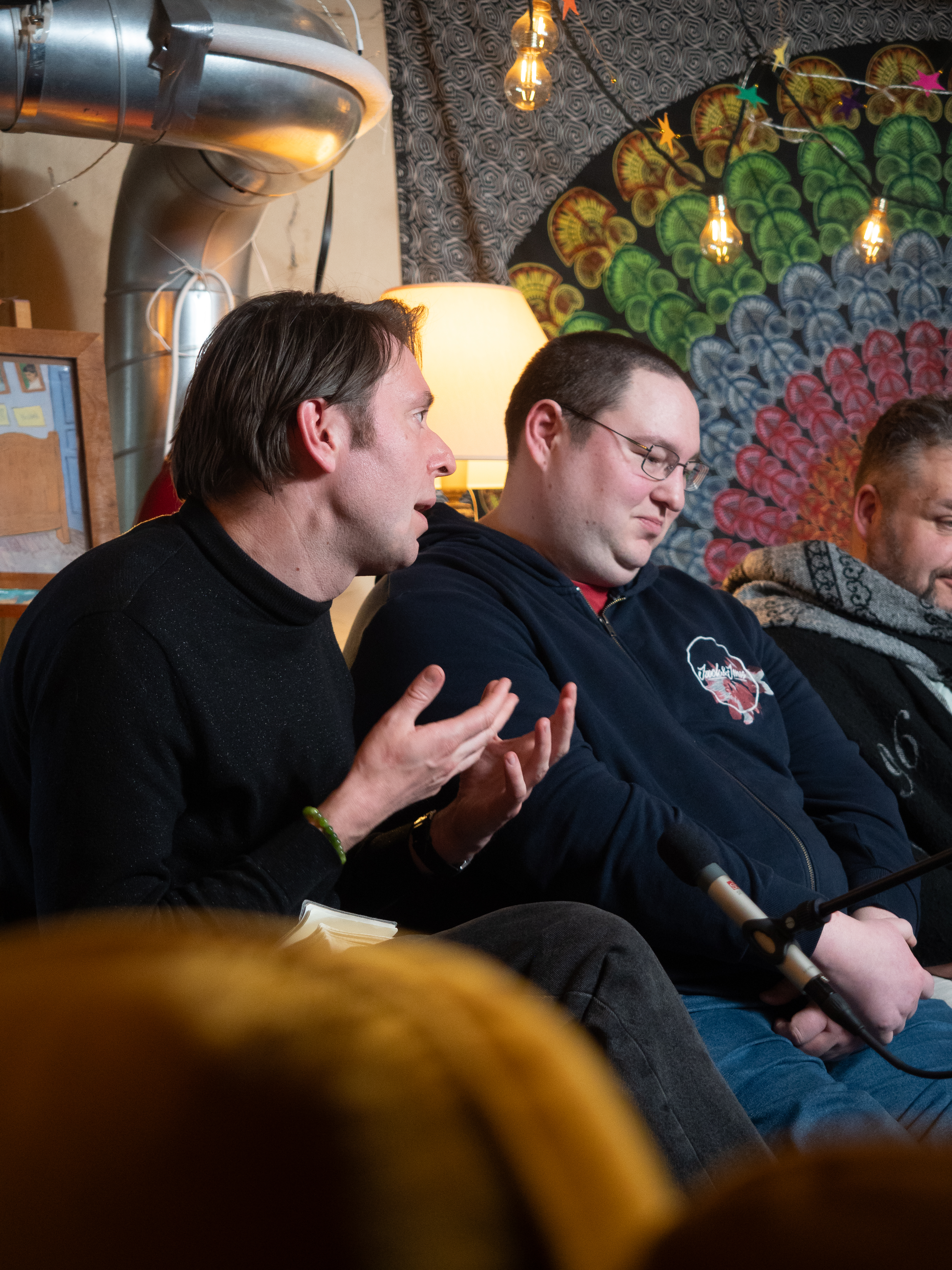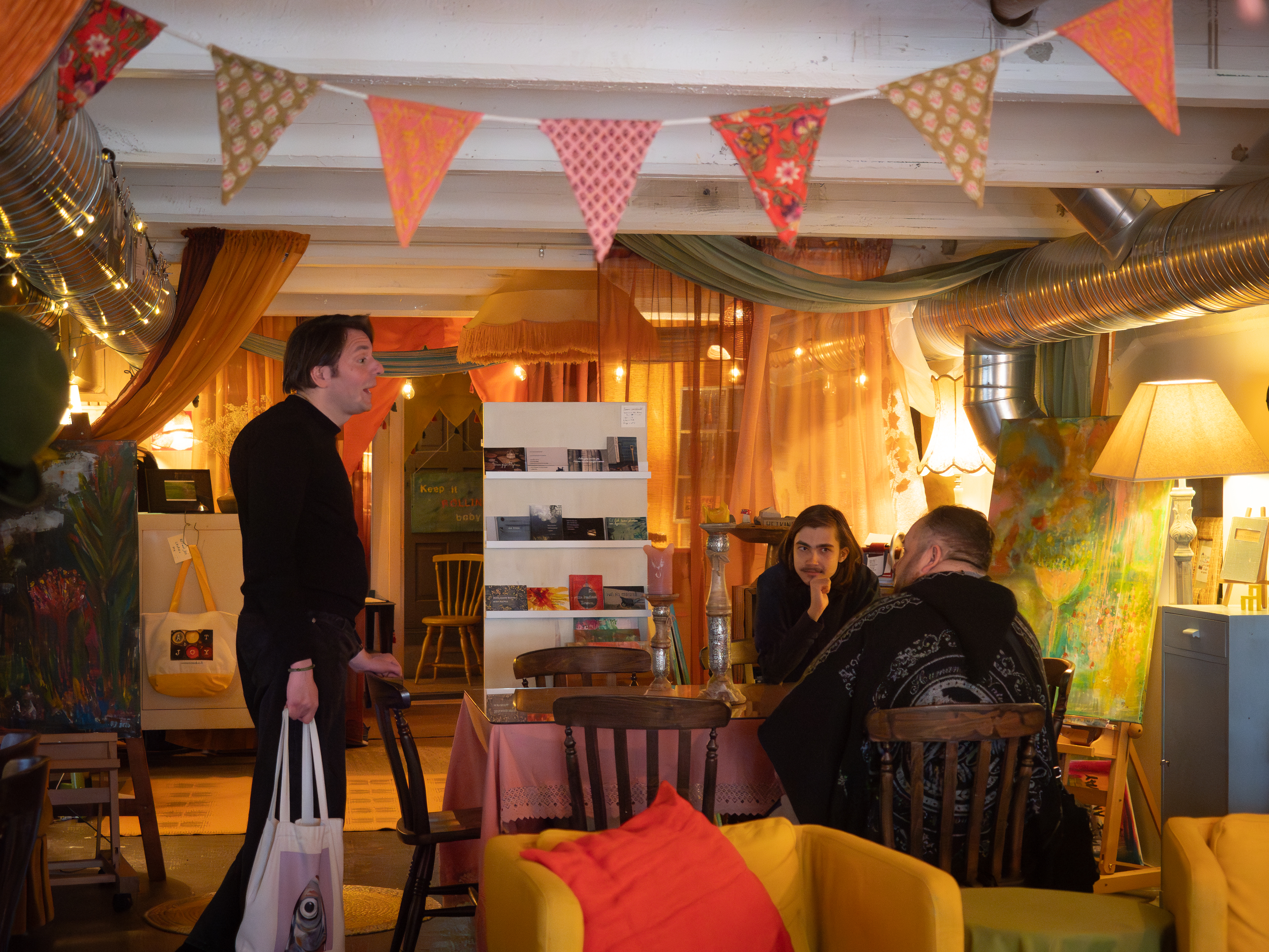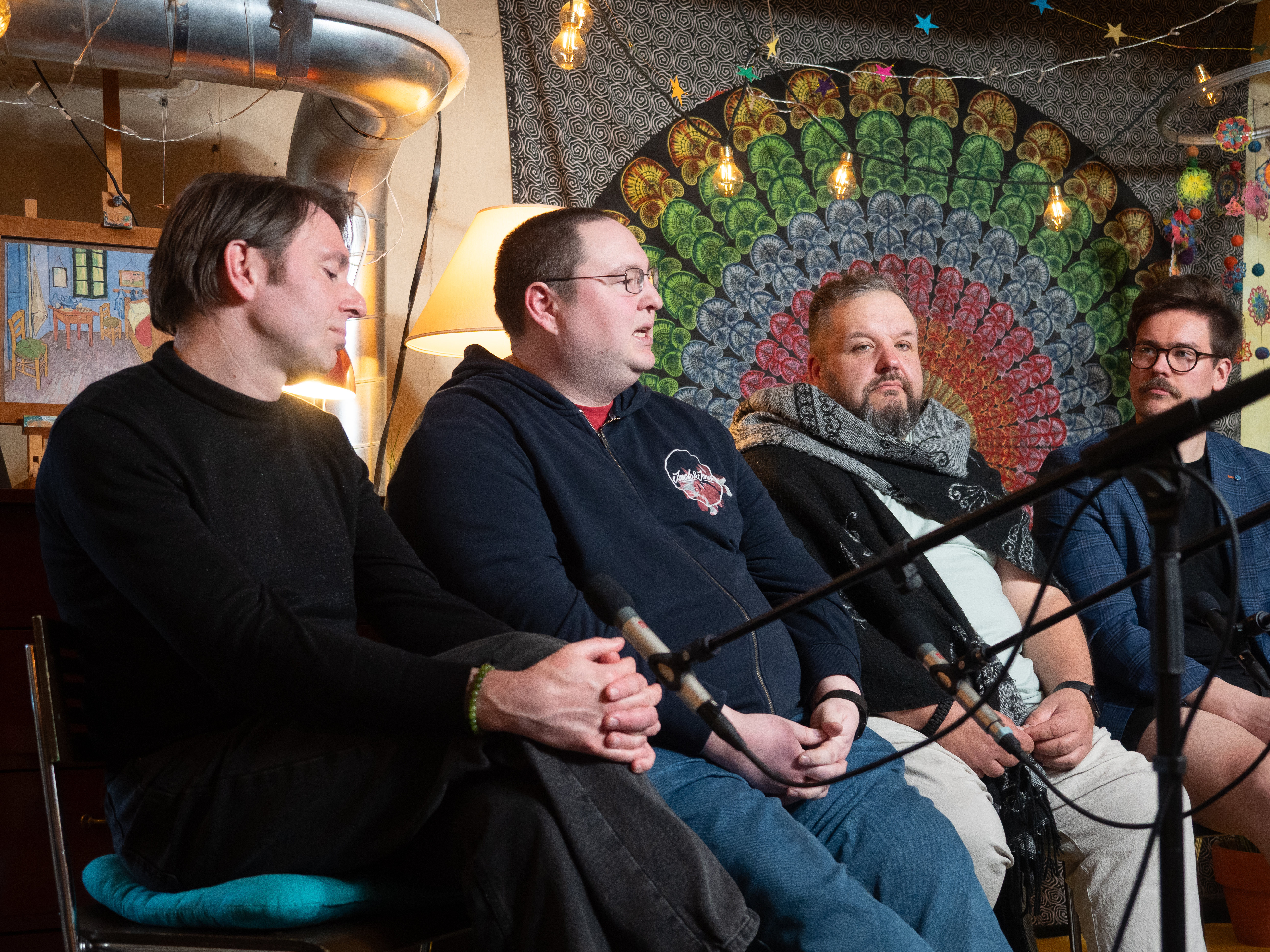 Hitusen hämyä indien paneelikeskustelu Pienen budjetin filosofiasta ja suurista unelmista järjestettiin 11.4. Hitusen hämyä indietapahtuman yhteydessä. Keskusteluun osallistuivat Aatos Äijö Espoosta, Miro Seppänen Tampereelta, Timo Puustinen Jyväskylästä, Jarno Harju Vantaalta ja Miikka J. Anttila Hämeenlinnasta. Keskustelu tallennettiin ja on tulossa loppuviikolla verkkoon. Tässä kuvasatoa keskusteluun valmistautumisesta ja tuokiokuvia keskustelusta. Kaikkien kuvien oikeudet Laura Arolla, kuvaajalla.